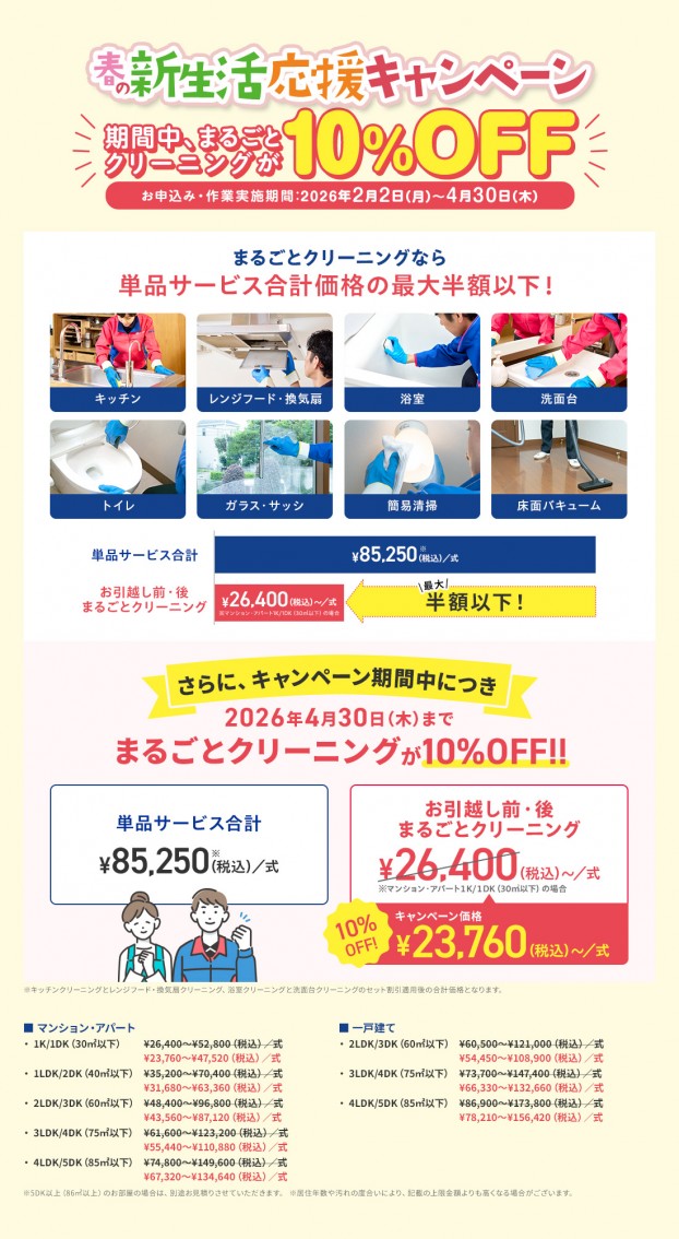 お引越し前・後まるごとクリーニングの価格は、お引越し前後どちらか一度のサービス価格です。